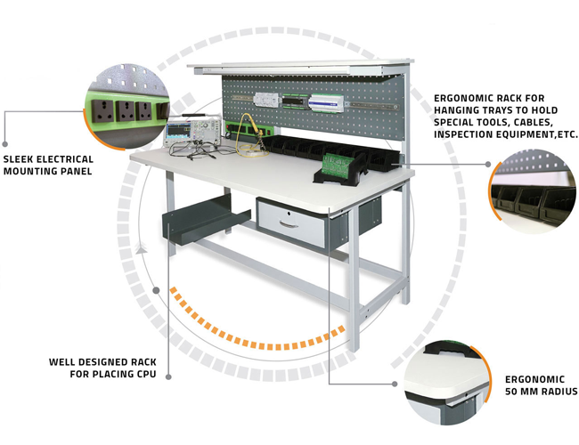ESD Workbenches establish a zero-potential ground between the floor/earth, a worksurface, and a user. Conductive ESD-safe surfaces channel, slow down, and shield electrically sensitive devices from defects and device failure.